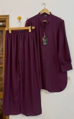 Elevate your style with this stunning WINTER GEORGETTE COORDSETS💜 Featuring a same-length shirt with *high cuff sleeves*, *puffy shoulders*, and an open collar design. Paide with loose-bottom *plazo pants*, this outfit is perfect for a chic and comfortable look. Ideal for casual outings or gatherings.